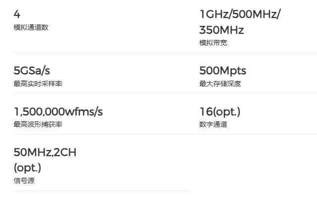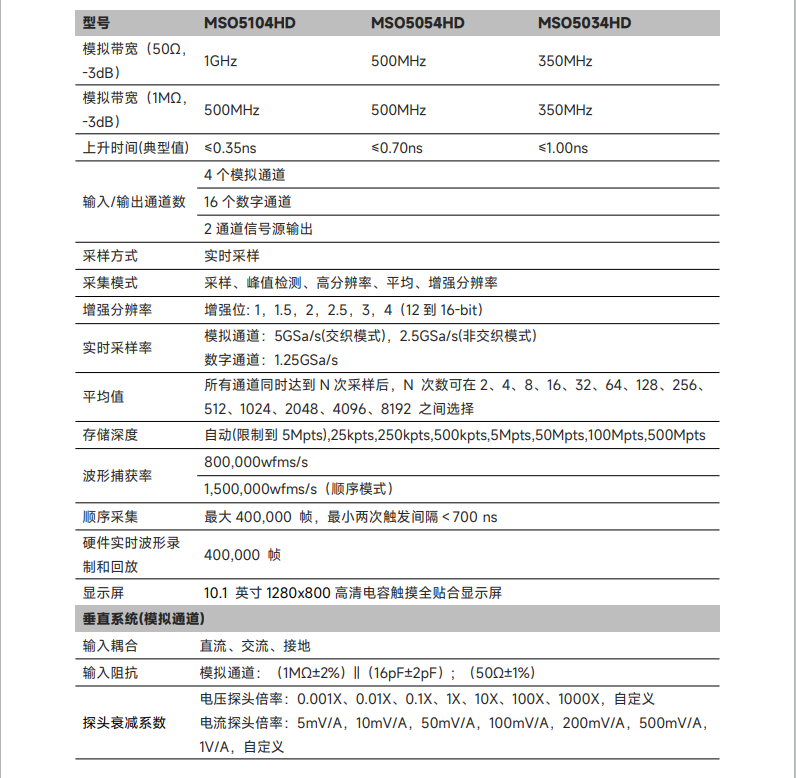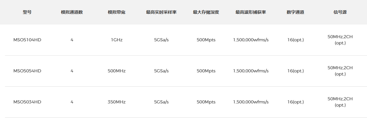 品牌:MSO5000HD是一款集成了4信号通道、16通道逻辑分析仪和2通道任意波形发生器的高分辨示波器,带宽高达1GHz,最大采样率高达5GSa/s,12bit ADC分辨率,配备了500M存储深度。