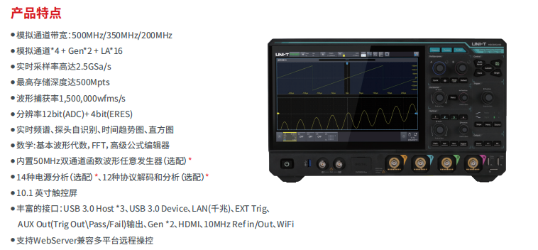 品牌:MSO3000HD是一款集成了4信号通道,16通道逻辑分析仪和2通道任意波形发生器的高分辨示波器。适用于医疗、低功耗设备、集成电路、高精度电源、电力、汽车电子等领域的各种测试和分析任务,是一款功能全、性能强大的仪器设备。