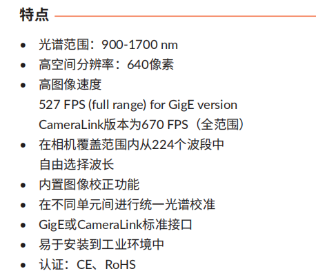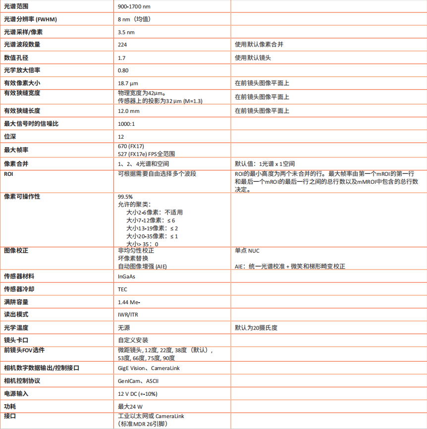品牌:Specim FX17相机专为工业和实验室使用而设计,并采用线扫描模式工作,用于收集近红外 NIR区域(900至1700 nm)的高光谱数据。