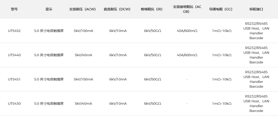 品牌:UT5400系列集交流耐压测试、直流耐压测试、绝缘阻抗测试、交流接地阻抗测试及导通电阻测试五大功能于一体,整机采用多重安全保护设计,可高精度、快速、安全地对电子设备和元件进行多种电气参数测试分析。