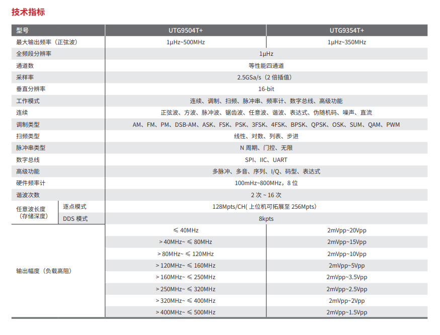 品牌:UTG9000T+系列是旗舰级函数/任意波形发生器,以极致性能满足严苛测试需求。输出频率高达500MHz,满足高速数字与通信应用。四通道支持任意耦合、合并与跟踪,配合优化的IQ模式,为无线通信与雷达仿真提供强大支持。