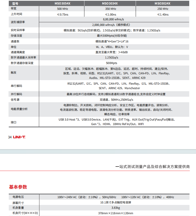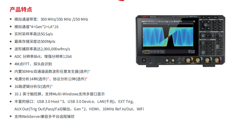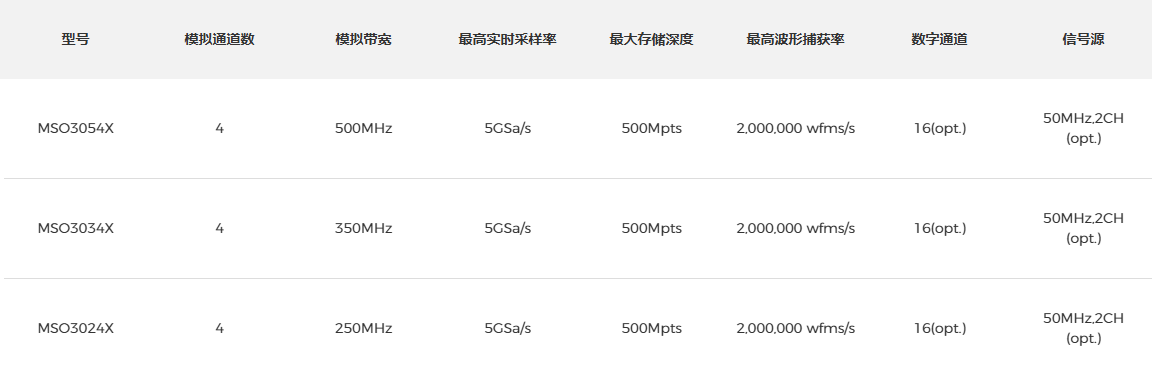 品牌:MSO3000X系列混合信号示波器,采样率最高5GSa/s,每通道存储深度可达500Mpts。采用独有的 Ultra Phospho® 3.0技术,波形捕获率高达2,000,000 wfms/s,先进的数字触发系统,触发灵敏度高