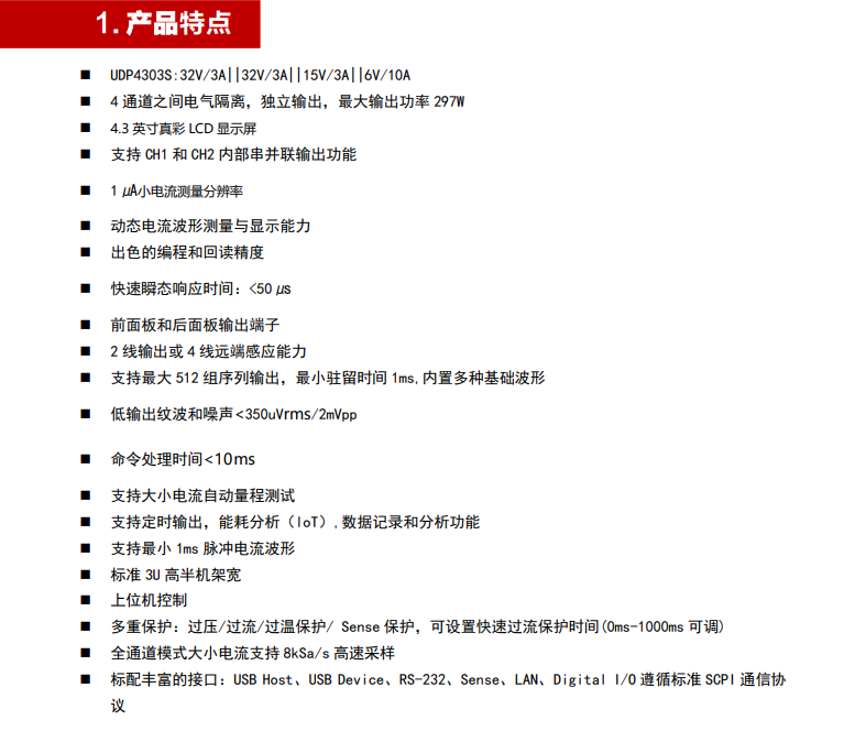 品牌:UDP4303S具备4通道电压、电流、功率波形实时显示功能,另有列表、监测器、触发器、录制器等电源完备的功能。具有稳定可靠的性能和用户友好的操作界面,操作简便,适用于半导体、传感器、IoT及智能穿戴等领域。
