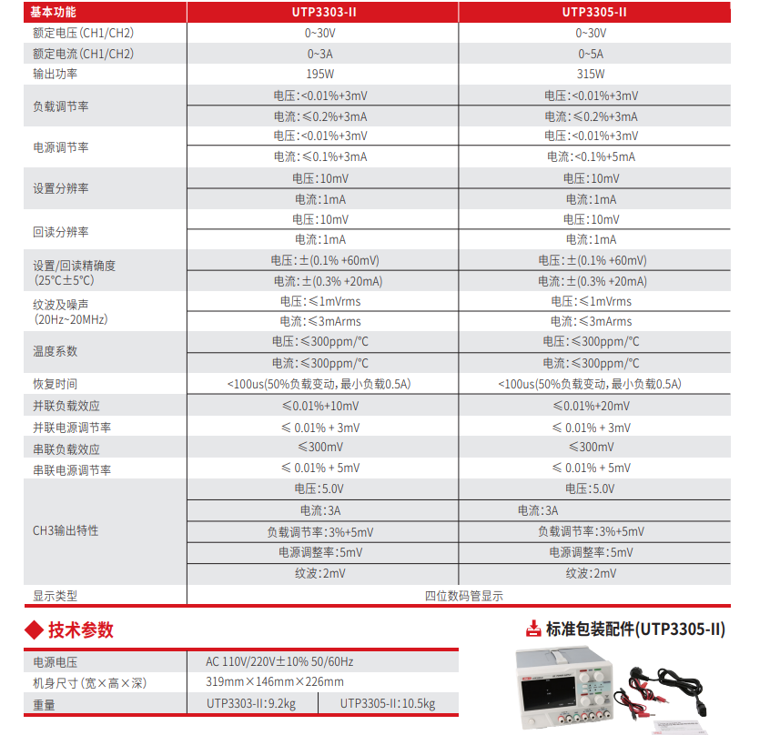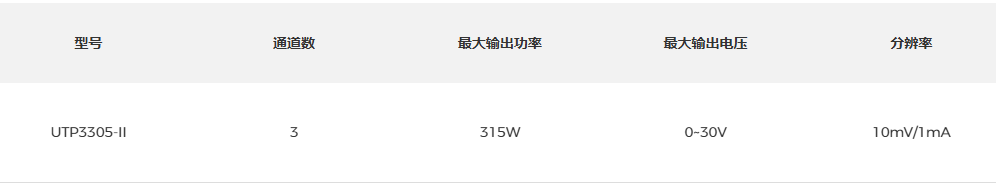 品牌:UTP3000-II系列直流电源是一类高性能的具有三路输出的线性直流电源。它拥有纯净的输出,优异的性能指标,应用于产品研发调试、质量控制和检测、生产自动化测试和教学实验等场景,可满足多样化的测试需求。